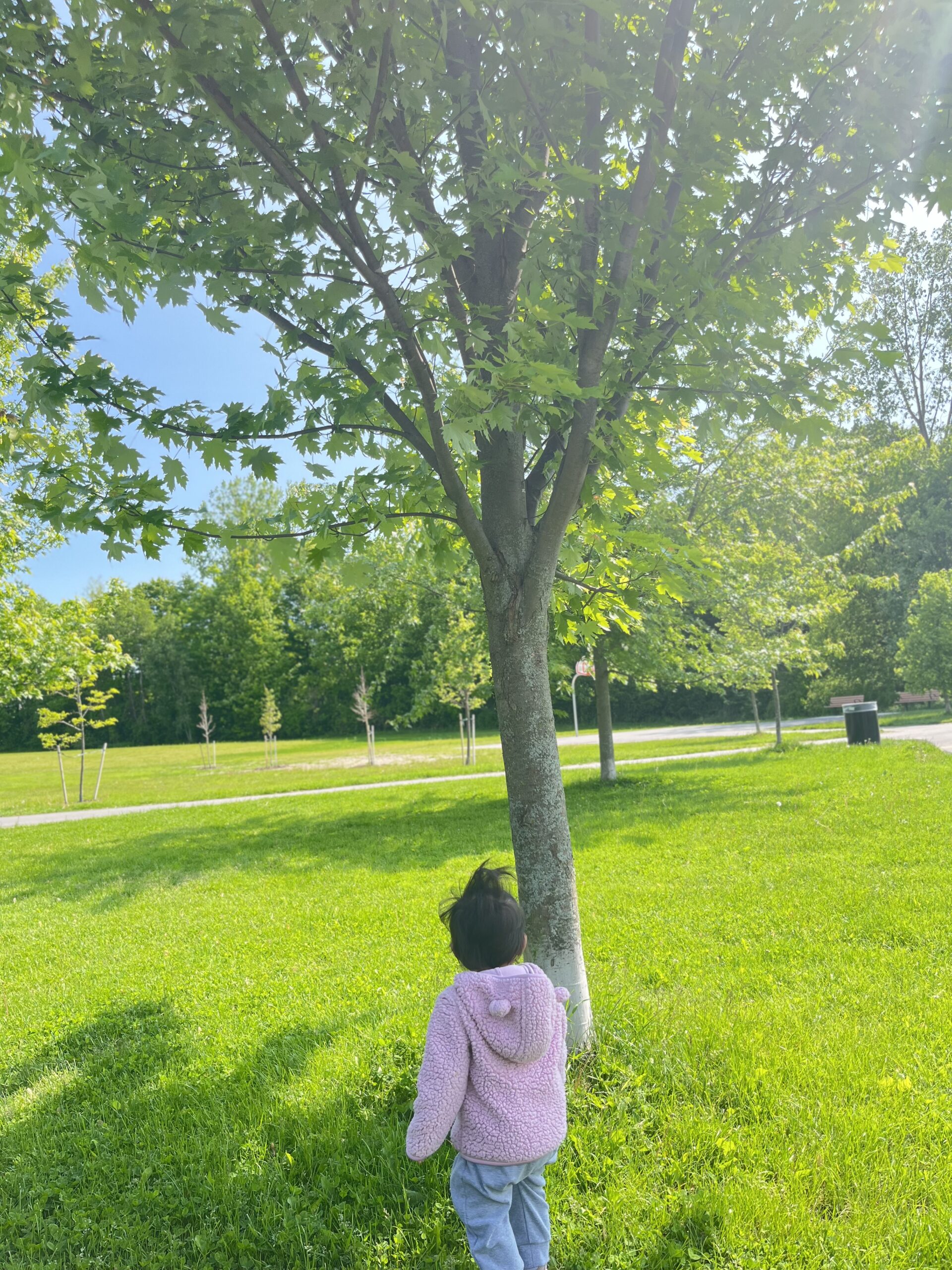 When we visited the park a few days after trying this play plan, she was more interested in the grass than the trees, likely because she could touch and explore it directly. We didn’t collect any leaves since none had fallen, and we didn’t want to pick the young ones still growing. We’re looking forward to a chance to gather real leaves later in the season, when nature offers them up freely.