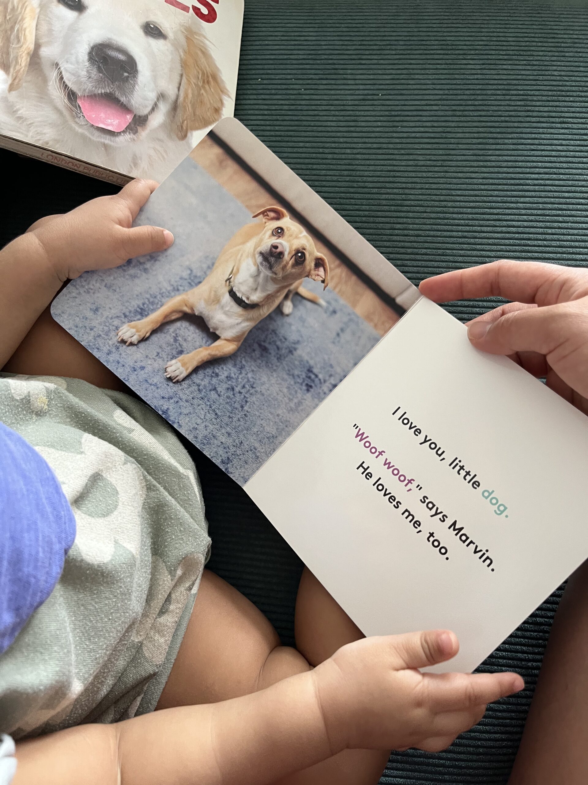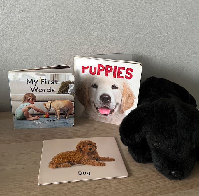 - Dog-themed board books, such as Lovevery’s “My First Words” book (featuring a dog and “woof woof”)