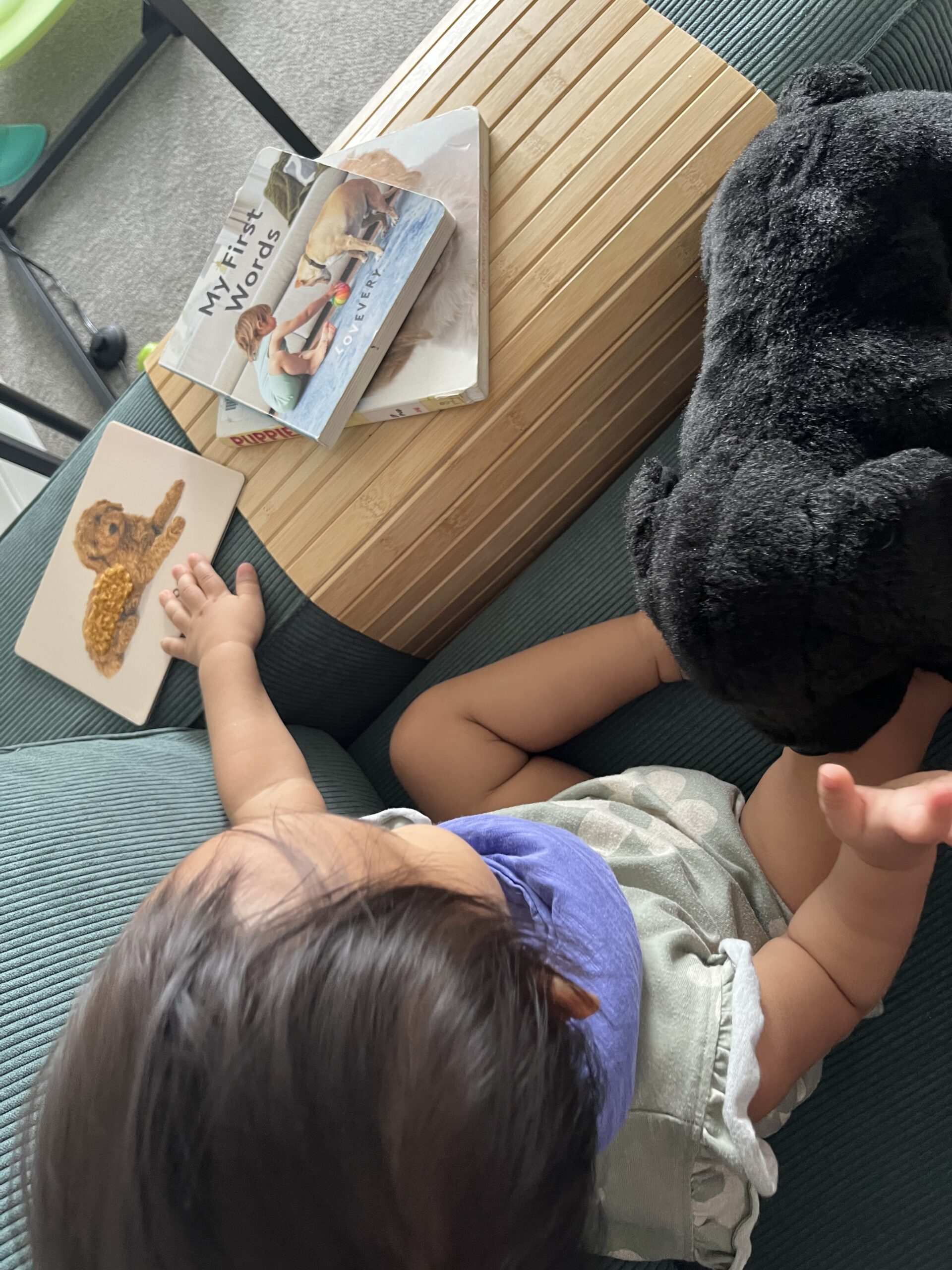 We read two books: the Lovevery “My First Words” during bedtime the night before and a book on puppies the following morning.