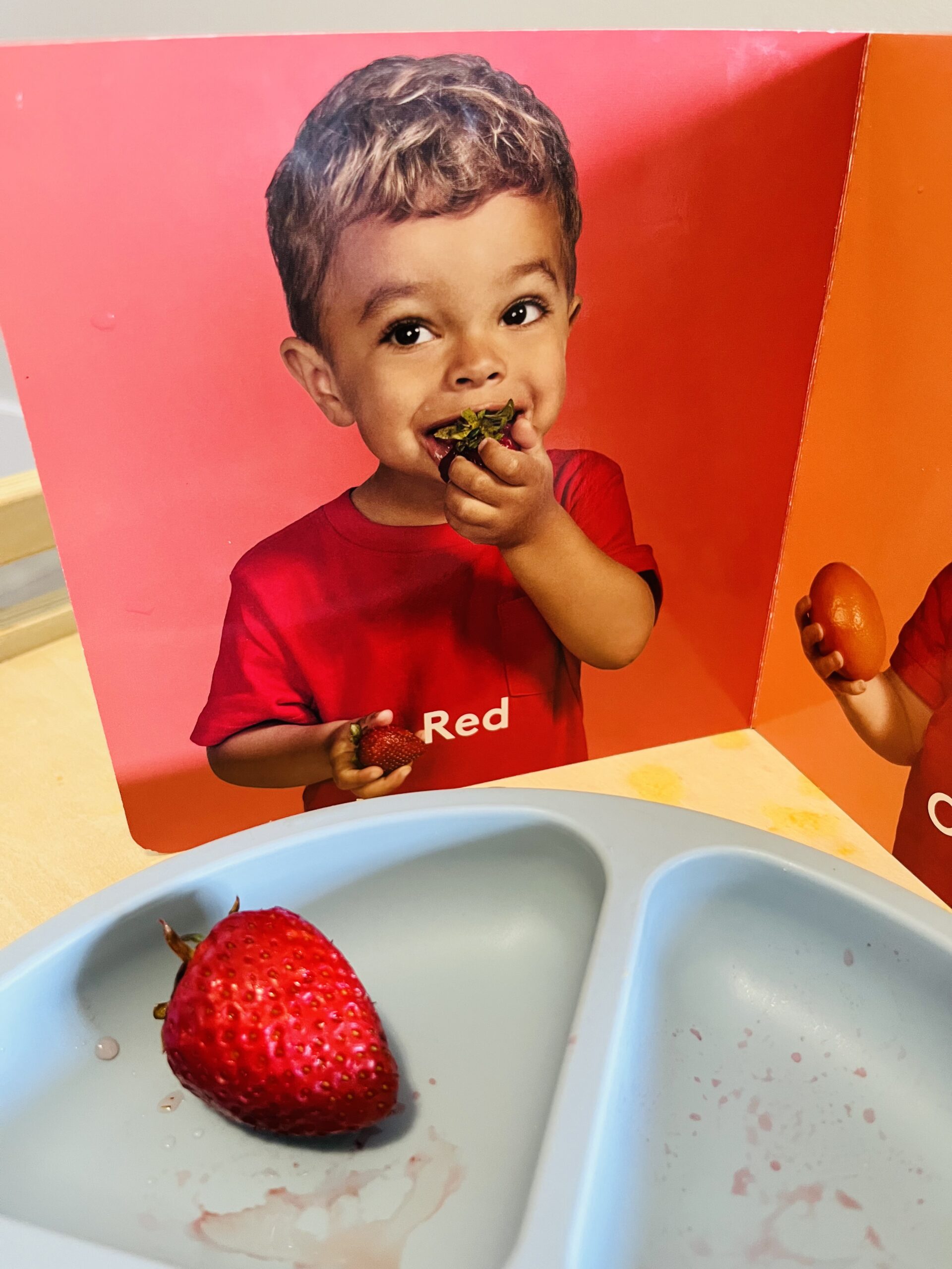 The most fun part of this experience for me was giving her a fresh whole strawberry to explore as we said “red” and “strawberry.” She hasn’t acquired the taste for it yet, but I loved being able to include a full sensory moment: letting her look at it, touch it, smell it, and even give it a try.