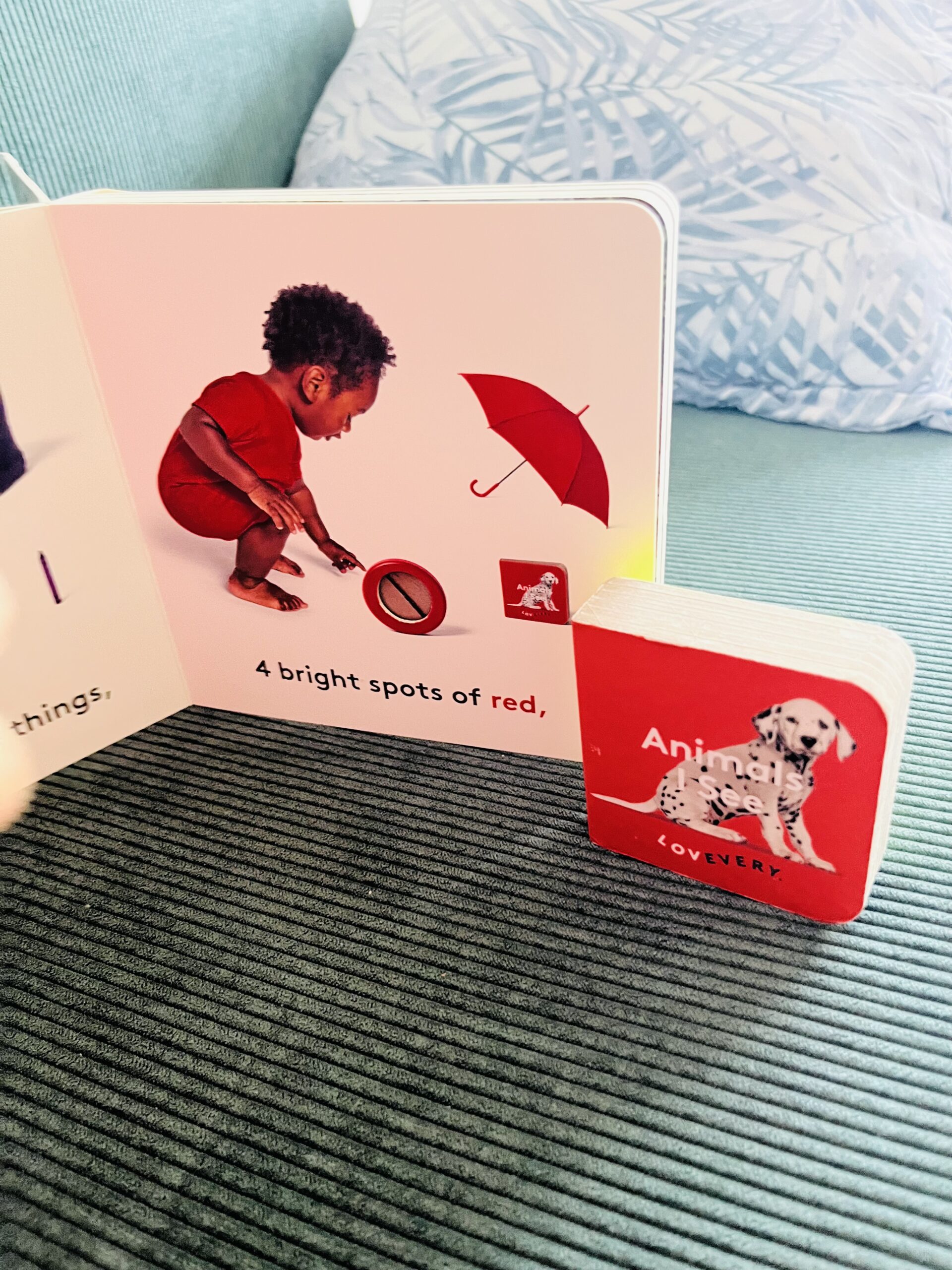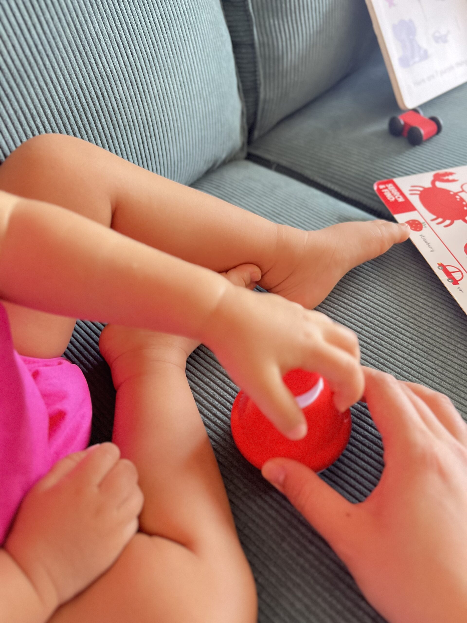 - Red objects from your toy shelf (e.g. Lovevery concertina, Animals I See book, the red balloon textured card)