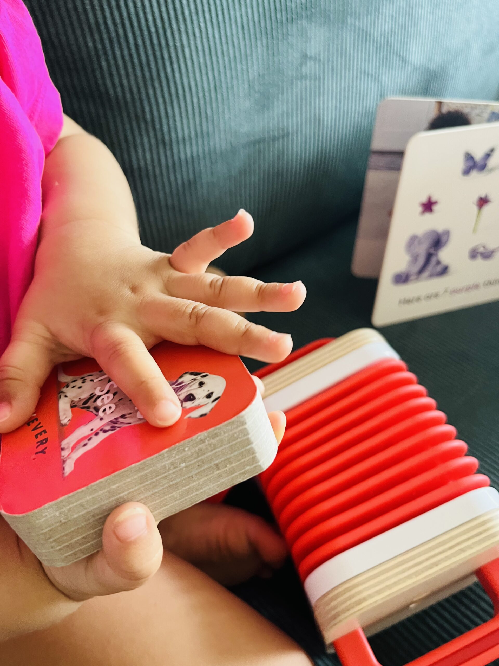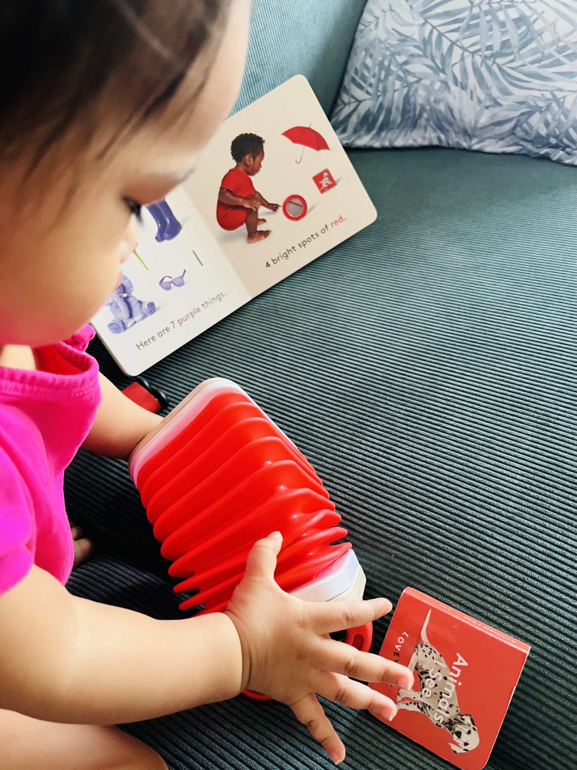 Let your toddler interact with red-themed objects like the red Lovevery concertina, red stacking cups, flashcards, or red toys.